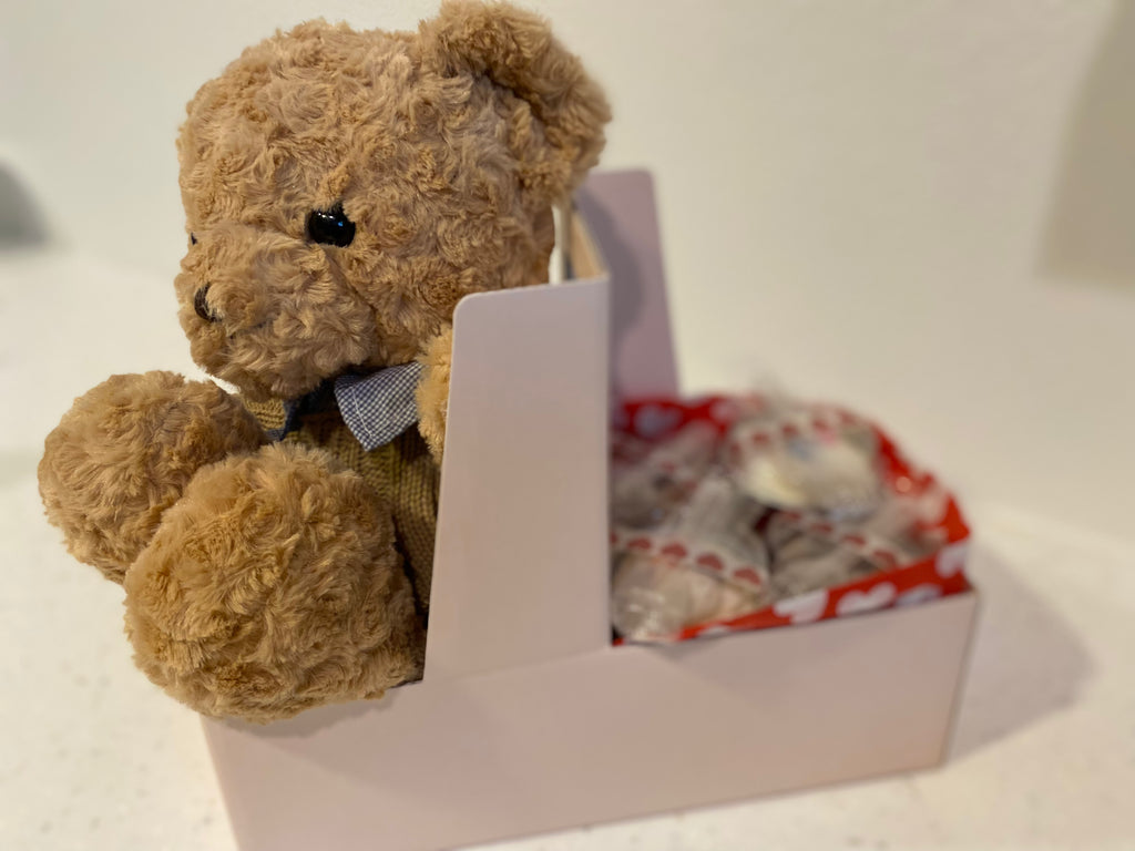 This snuggly brown bear is accompanied in a carrying case by 9 Hunkies (cupcakes)! The cupcakes are Red Velvet (3), Chocolate (3), and Vanilla (3) This little bear is sure to melt the heart of that special someone! Local Delivery is included just pick your delivery date in the cart. This is a great gift for your significant other, teachers, kids, or a friend that deserves a little extra love! Happy Valentines Day!